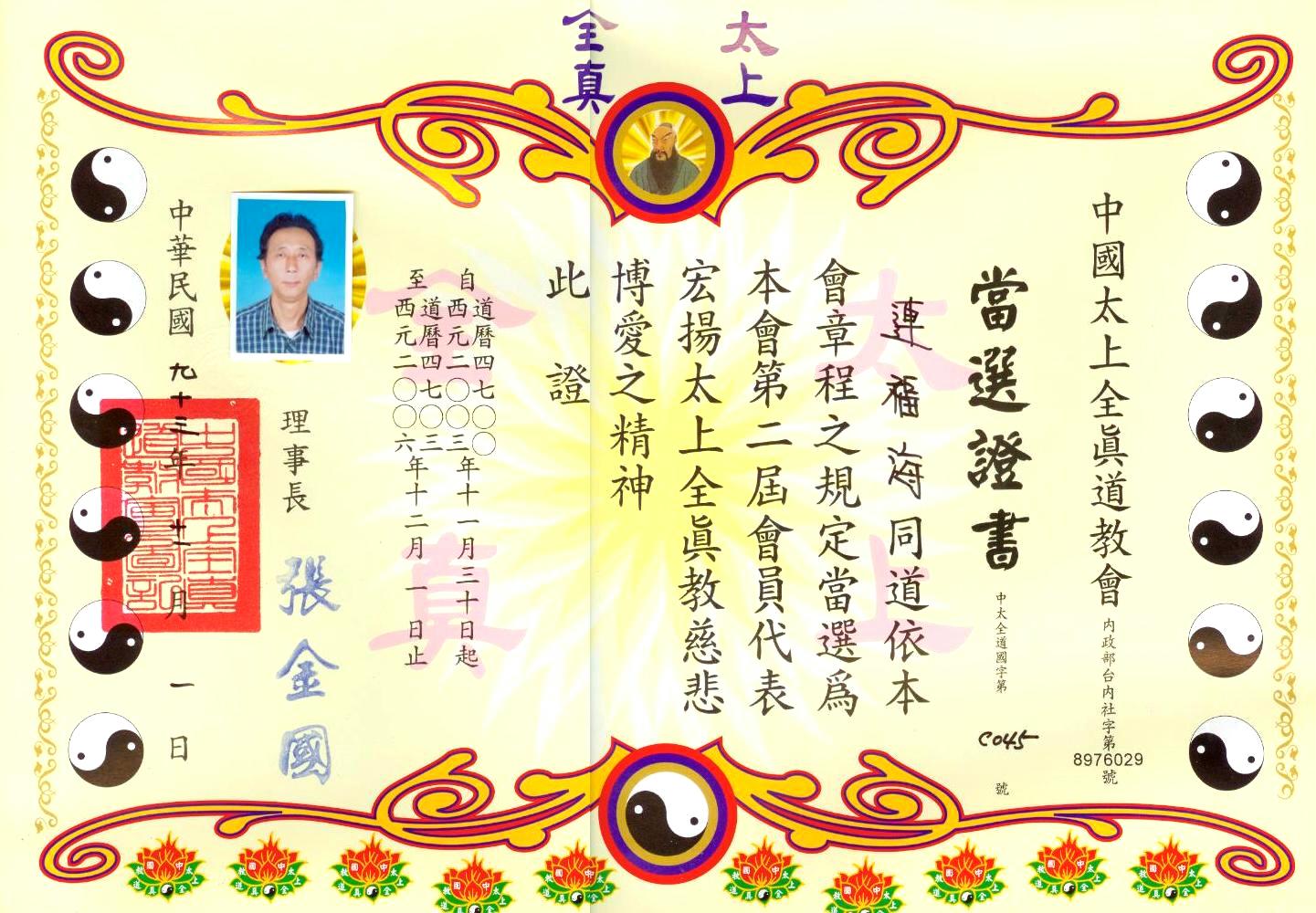 太上全真會員代表當選證書