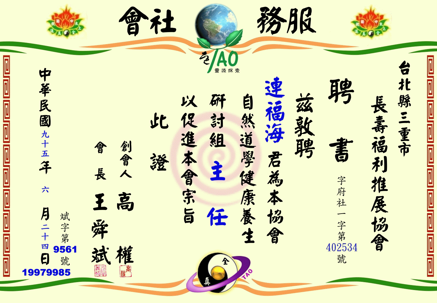 太上全真會員代表當選證書
