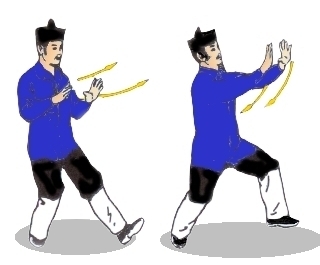 ⑵重心前移到左腳上,全腳掌著地,上體前移,右腳趾著地,腳跟抬起,兩向前推出,與眼同高,同時呼氣。