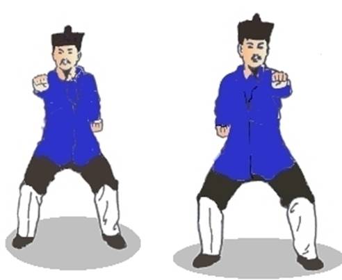 姿勢:接上式,從弓步變化成馬步,兩手變拳放在腰旁,拳心朝上。