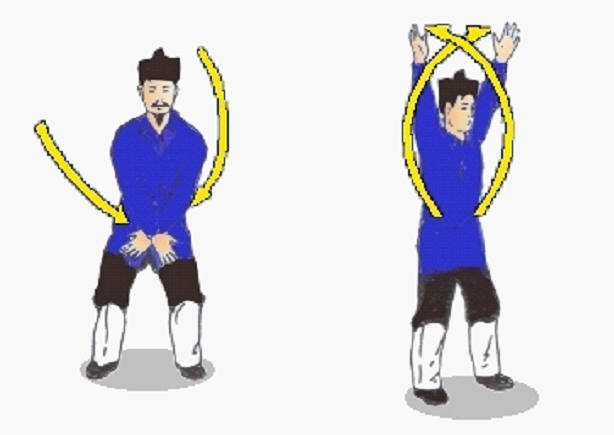 要點:輪臂時,兩手是以兩肩關節的圓心,從內下往外上劃兩個大圓形。兩手在頭頂時,可抬頭挺胸,幫助吸氣。吸氣時膝關節伸直,呼氣時膝關節彎曲。